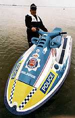 In recent years there has been an explosion in the number of Jetskis around the waters of Essex so during the summers of 1996 and 97, a marine firm, EP Barrus sponsored the unit with jet powered craft, which will be patrolling again this summer. The JetSki helps to supplement the inflatable boats on the fast shallow water patrols. The section has a number of other craft including a 40ft launch, Vigilant III, plus a 33ft launch, Alert III. The unit has two rubber inflatable boats (RIBs) and a dory which is similar to a RIB but is solid and has two outboard motors. Working closely with other agencies is a high priority for the Marine Section. They support the work of the RNLI under the control of the coastguard in search and rescue operations. They also enforce the bylaws and the Merchant Shipping Act. They work closely with Customs, Immigration and the Port Authorities as well as other police forces in Kent, Suffolk and the Metropolitan Police. |